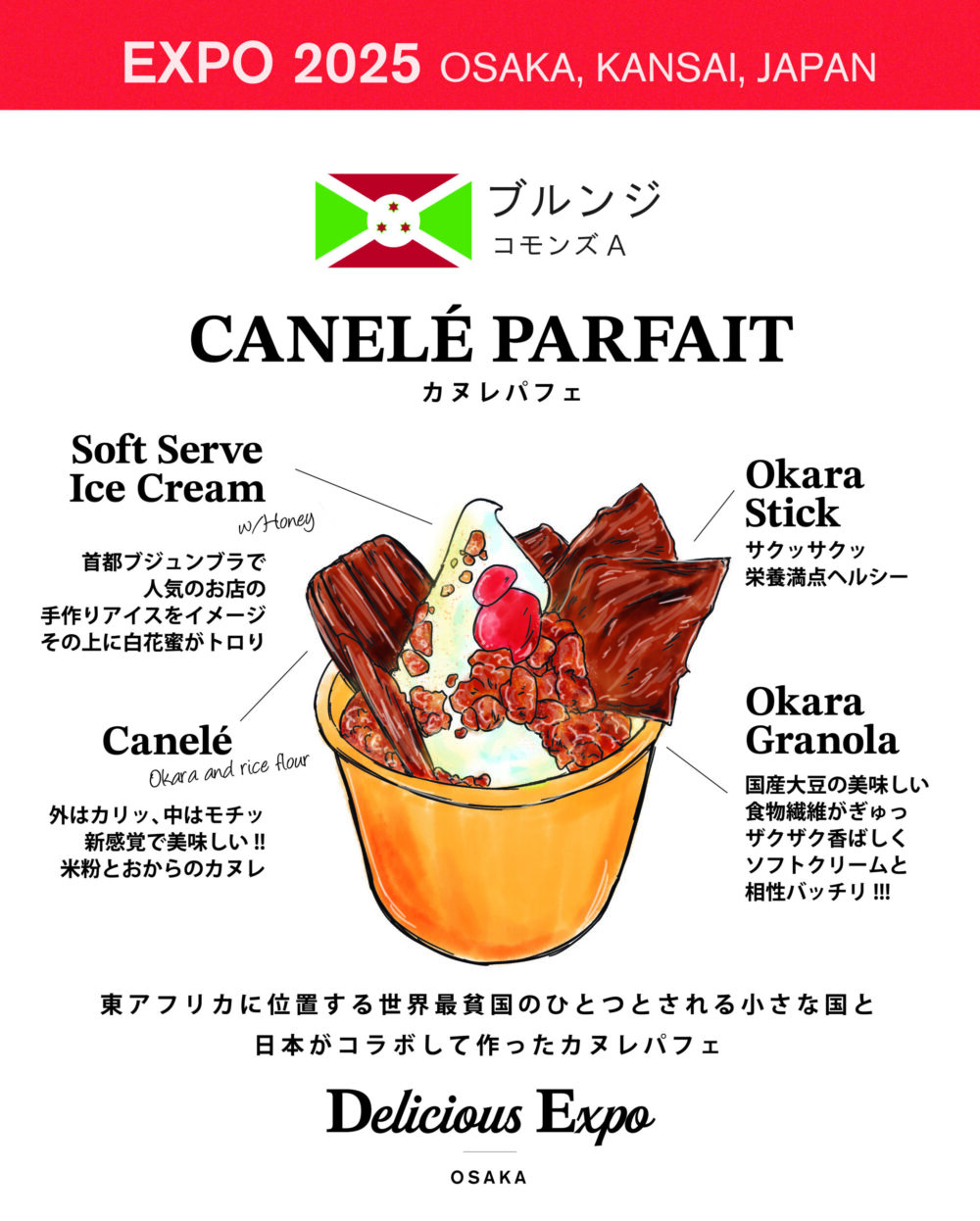 パフェにはブルンジのはちみつが使われていて、おからをたっぷり使用したパフェ。